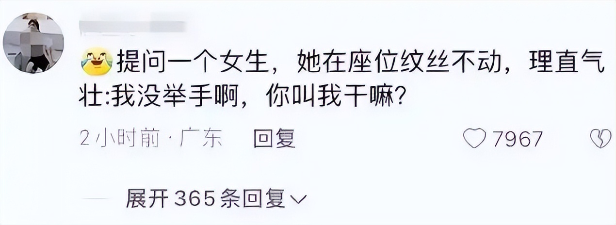 还有老师叫同学回答问题,这位宝宝坐着纹丝不动,理直气壮地说:“老师,我没举手,你叫我干嘛?”