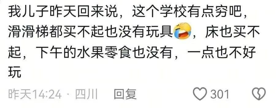 “这学校有点穷吧,滑滑梯买不起,玩具也没有,床也没有,水果零食也没有,一点儿也不好玩。”